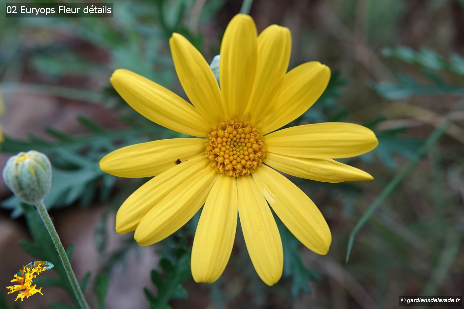 L’Euryops chrysanthemoide est cultivée comme plante ornementale sous nos contrées, classée dans la famille des Asteraceae facile à reconnaitre. C’est une espèce à feuillage persistant aux fleurs d’un jaune vif qui peut dépasser 1 m de haut. Elle est originaire d'Afrique du Sud et plus précisément des KwaZulu-Natal, Mpumalanga et Swaziland de la région du Cap-Oriental. Les feuilles sont d'un vert brillant, bien découpées en segments profondément indentés, jusqu’à 10 cm de long sur 1 à 3 cm de large (pennatilobée à pennatipartite). Les fleurs d'un jaune brillant sont regroupées en capitules solitaires de 4 cm de diamètre, avec au centre les fleurs tubulées entourées d’une couronne de fleurs ligulées. Elle se développe dans tout type de sol drainé et est adaptée au climat maritime et au vent de la presqu’ile.