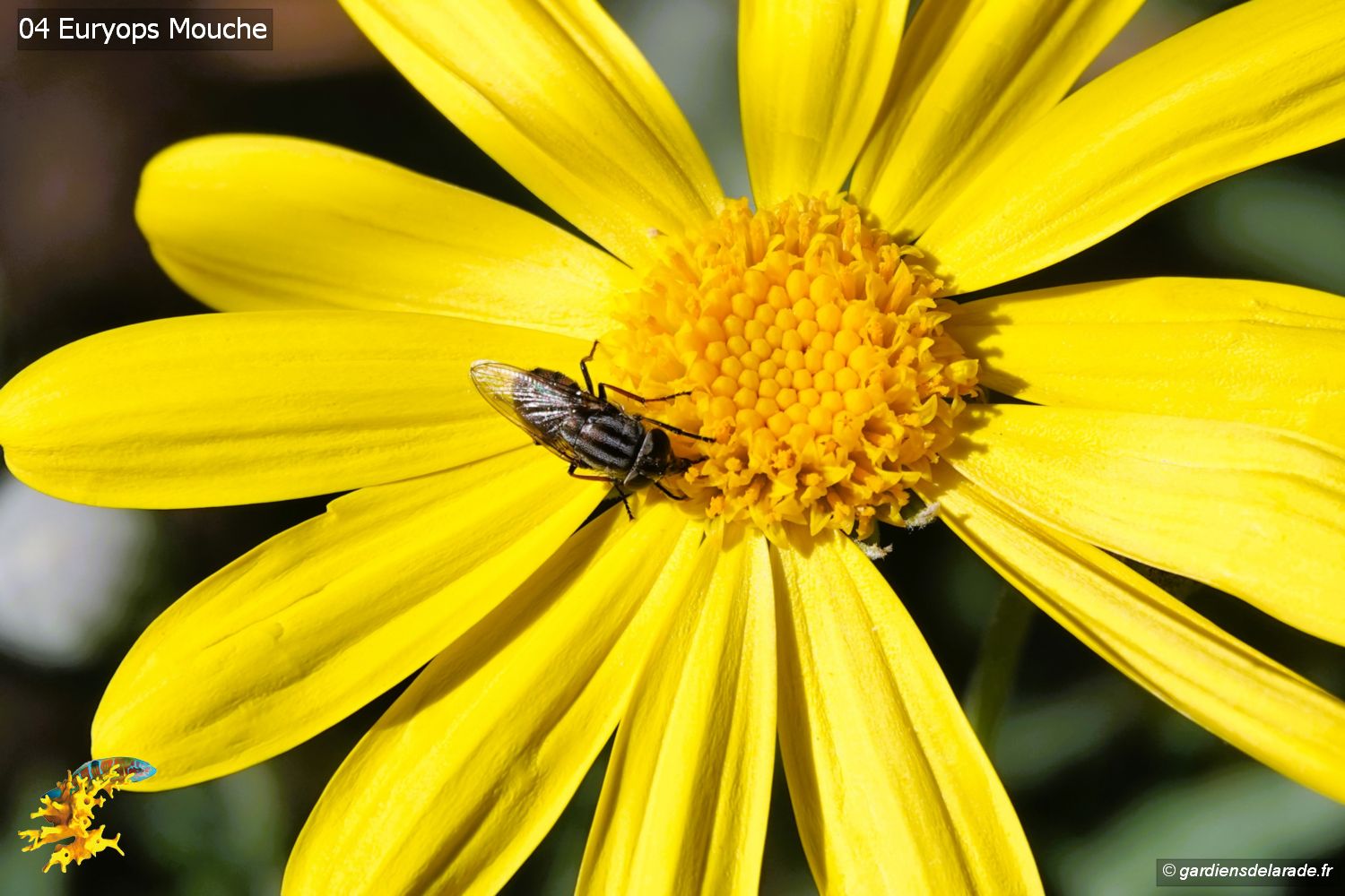 Les fleurs de l’Euryops chrysanthème attirent les rares insectes encore actifs en cette saison comme les bourdons du genre Bombus qui affrontent vaillamment les premiers frimas hivernaux.