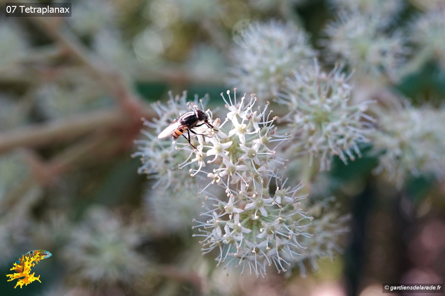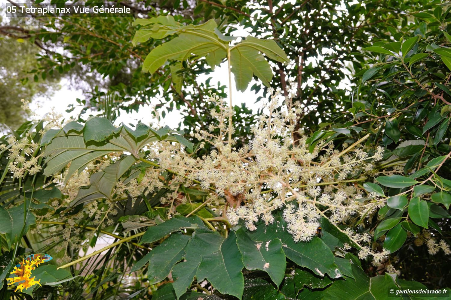 La Plante à papier de riz (Tetrapanax papyrifera), parfois nommé "Tung-tsau", est originaire de Taïwan et du Sud de la Chine où la moelle de ses tiges lignifiées était utilisée pour fabriquer le papier de riz traditionnel. Elle a été classée dans la famille des Araliacées. De grande taille, elle est facilement reconnaissable à ses feuilles vert tendre, au-dessous veloutées, profondément découpées et qui peuvent atteindre 1 m d'envergure. En ce moment, les inflorescences en corymbes blancs parfumées pouvant également atteindre 1 m de hauteur sont apparues.