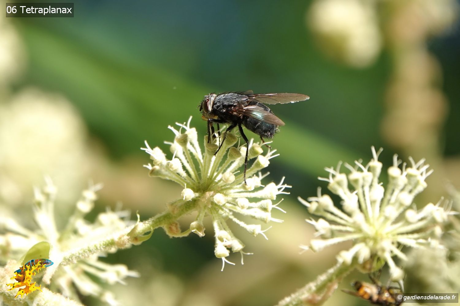 Les fleurs sous forme de pompons attirent en nombre les insectes dont différentes espèces de mouche, les bourdons mais aussi les frelons asiatiques qui d’ailleurs attrapent les mouches imprudentes pour les dévorer. Les fruits apparaitront plus tard sous la forme de petites baies noires qui sont mangées par les oiseaux.