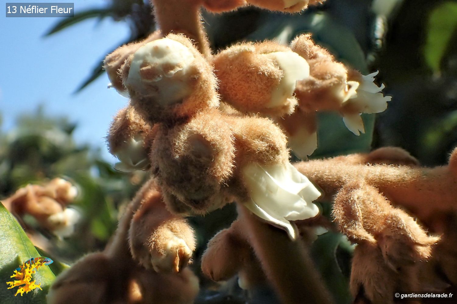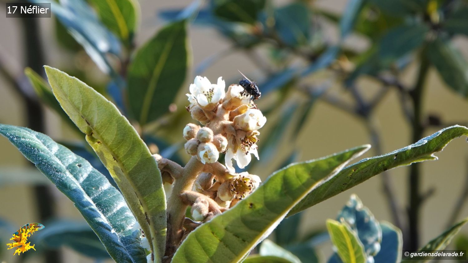 Les Néfliers du Japon (Eriobotrya japonica) encore appelés Bibaciers sont encore en fleur alors que la floraison a commencé en septembre. Cette espèce est originaire des montagnes du Sichuan et du Yunnan dans le sud-ouest de la Chine. C’est dans la province de Hubei que la plante aurait été cultivée la première fois puis introduite au Japon au XIeme siècle pour gagner le bassin méditerranéen au XVIIme siècle. Les fleurs composées de 5 pétales d’un blanc crème sont recouvertes d'un duvet roussâtre. Elles sont regroupées en panicules terminales de forme conique. Le néflier a donc été classé dans la famille des Rosaceae avec les pommiers et les poiriers.