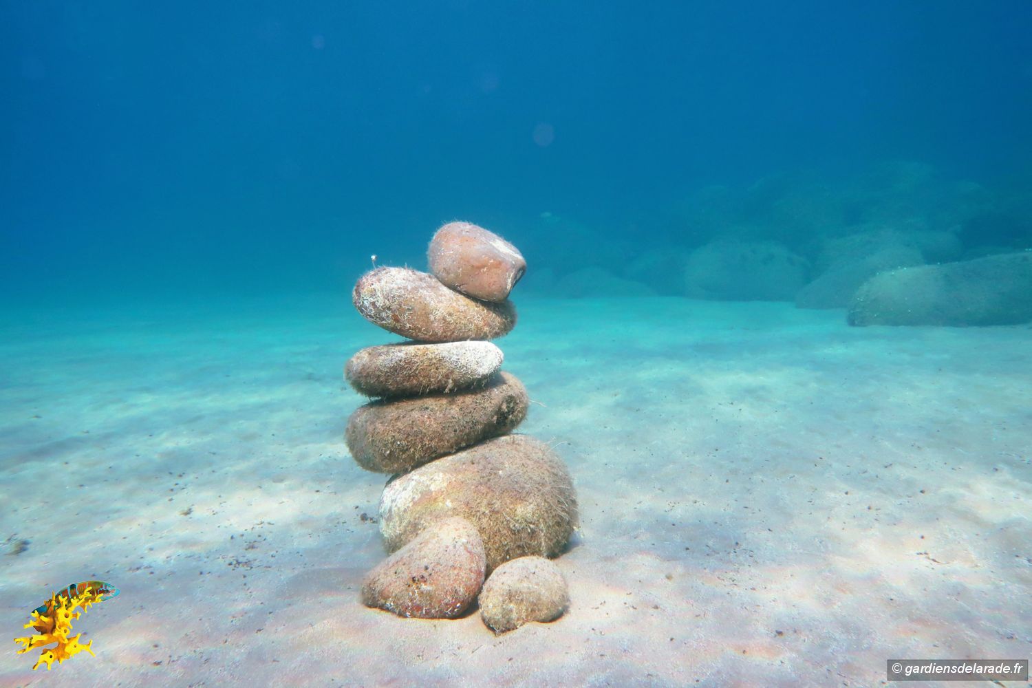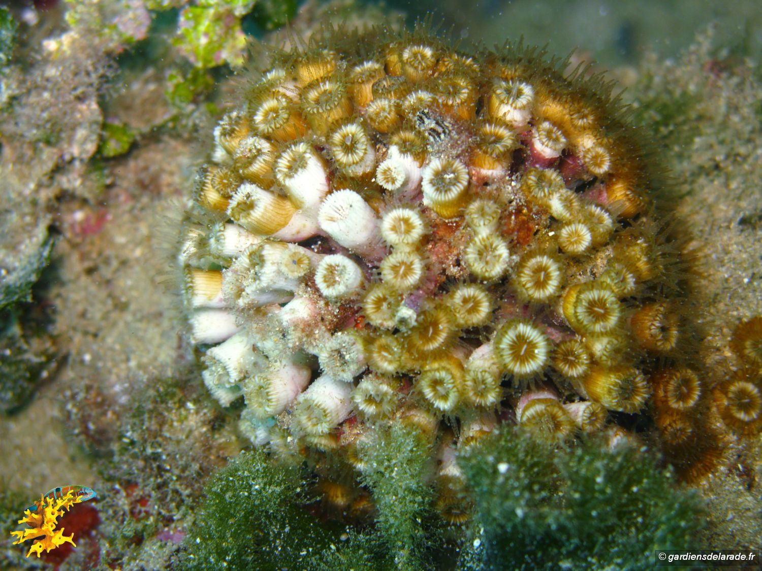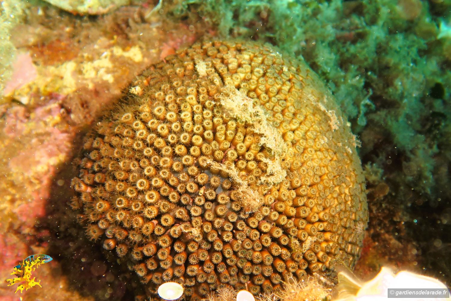 Pour voir un cladocore il vous faudra un masque et mettre la tête sous l’eau baignant le littoral de la presqu’ile. Lorsque vous verrez un premier cairn, nagez à gauche, alors vous le verrez accroché à un rocher, le cladocore en touffe (Cladocora caespitosa).