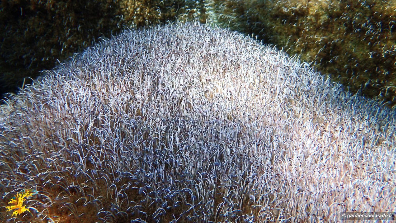 L'acétabulaire, vous la reconnaitrez facilement grâce à son look très particulier d’ombrelle en miniature d’environ 5 cm de haut d’un vert pâle à blanc. C’est une algue, classée dans les algues vertes (Chlorophycées) qui est bien visible ce moment en grand nombre sur le haut des rochers exposés au soleil par petits fonds, 1 à 2 m de profondeur, comme ceux de la plage de la Coudoulière.