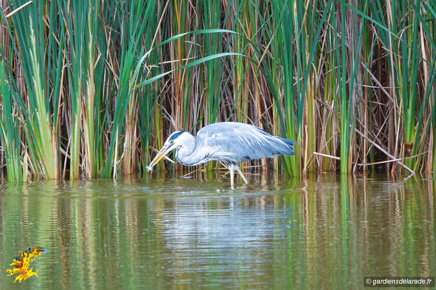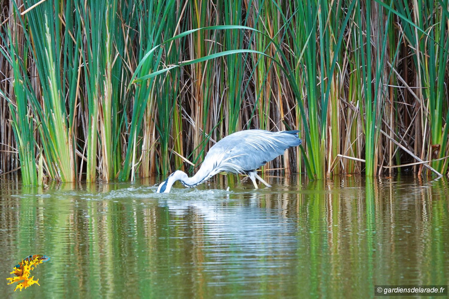 Le héron pêche à l'affût. Il attend immobile, guettant une proie : poisson grenouille serpent, mulots ou autres petits rongeurs. Une fois localisée, lorsqu’elle passe à portée il tend son cou et d'un rapide coup de bec il s’en saisi et l’avale prestement en une seule gorgée.