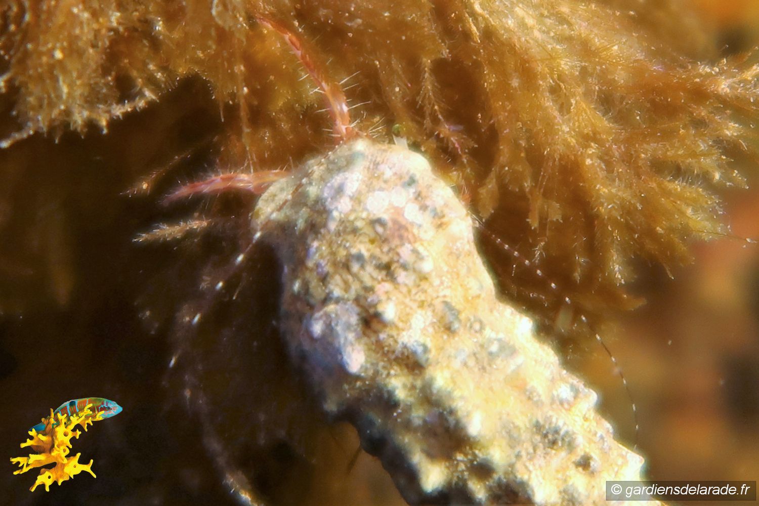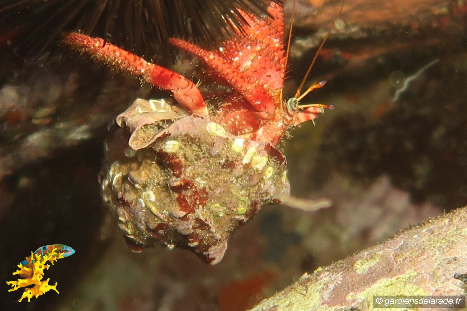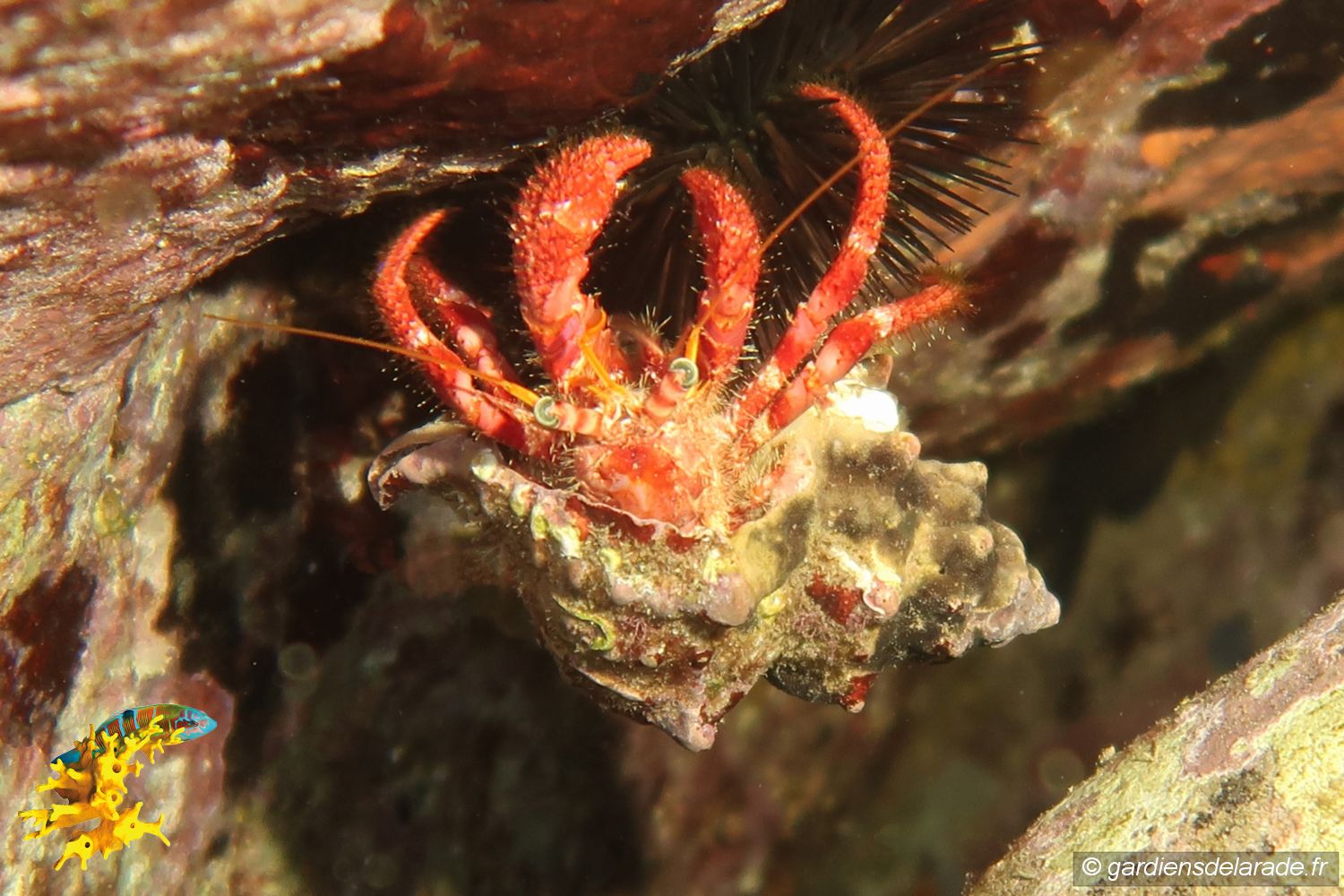 Un magnifique pagure, un grand Bernard l'Hermite (certainement Dardanus calidus) qui a choisi de s’abriter dans une coquille vide du mollusque Rocher fascié (Hexaplex trunculus) déambule accroché à la surface de la paroi d’une faille émergeant d’un herbier de Posidonie. Caractéristique de l’espèce, la pince droite est plus petite que la pince gauche servant à découper les restes de cadavres d’animaux. Un plus petit Bernard l’Hermite, le Pagure anachorète (Pagurus anachoretus) à pattes poilues, marron rayées de blanc comme ses antennes est suspendu à une algue. Les yeux sont verts et au bout d'un pédoncule blanc. Il s’est abrité dans une coquille de Cérithe-goumier (Cerithium vulgatum) très commune en Méditerranée.