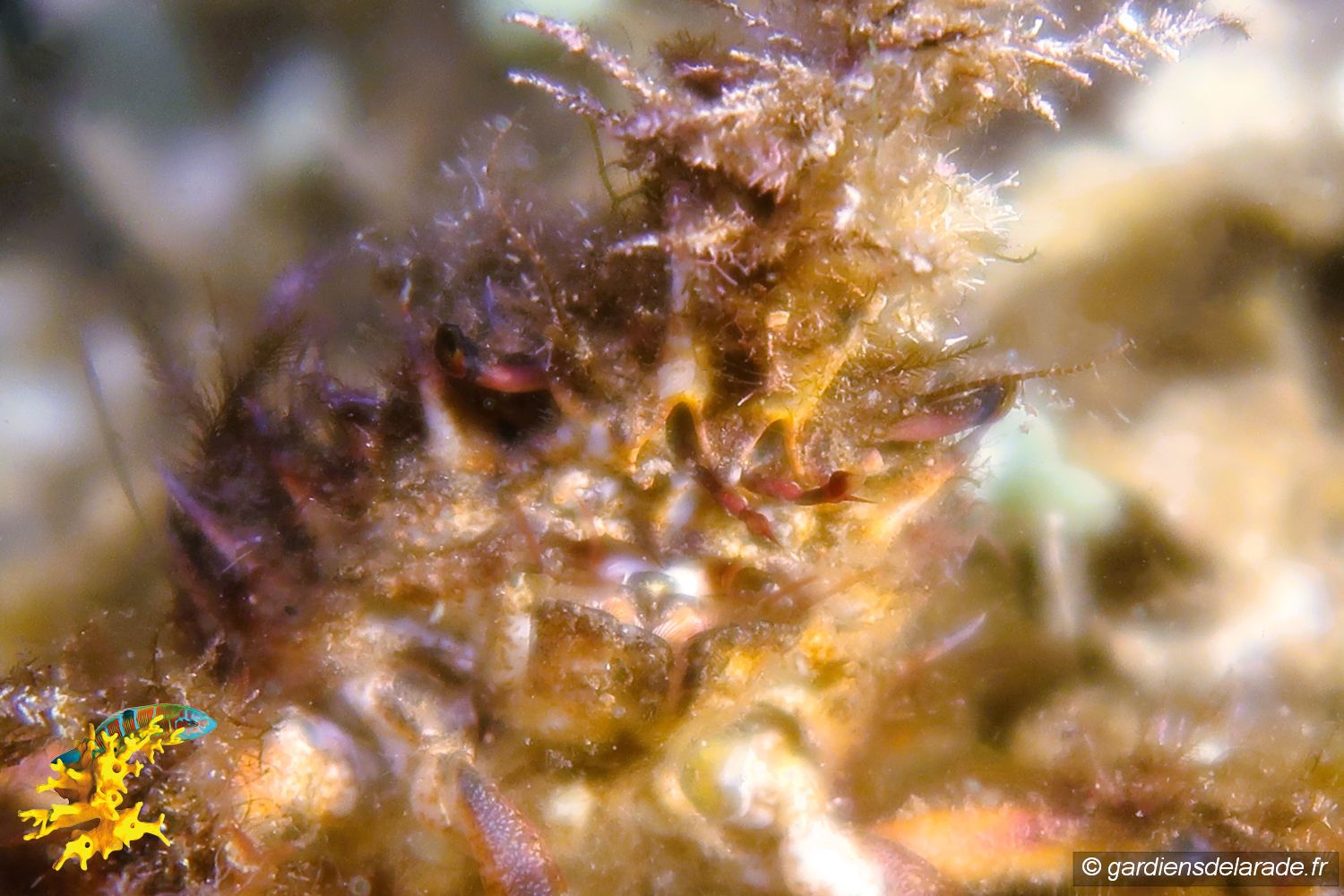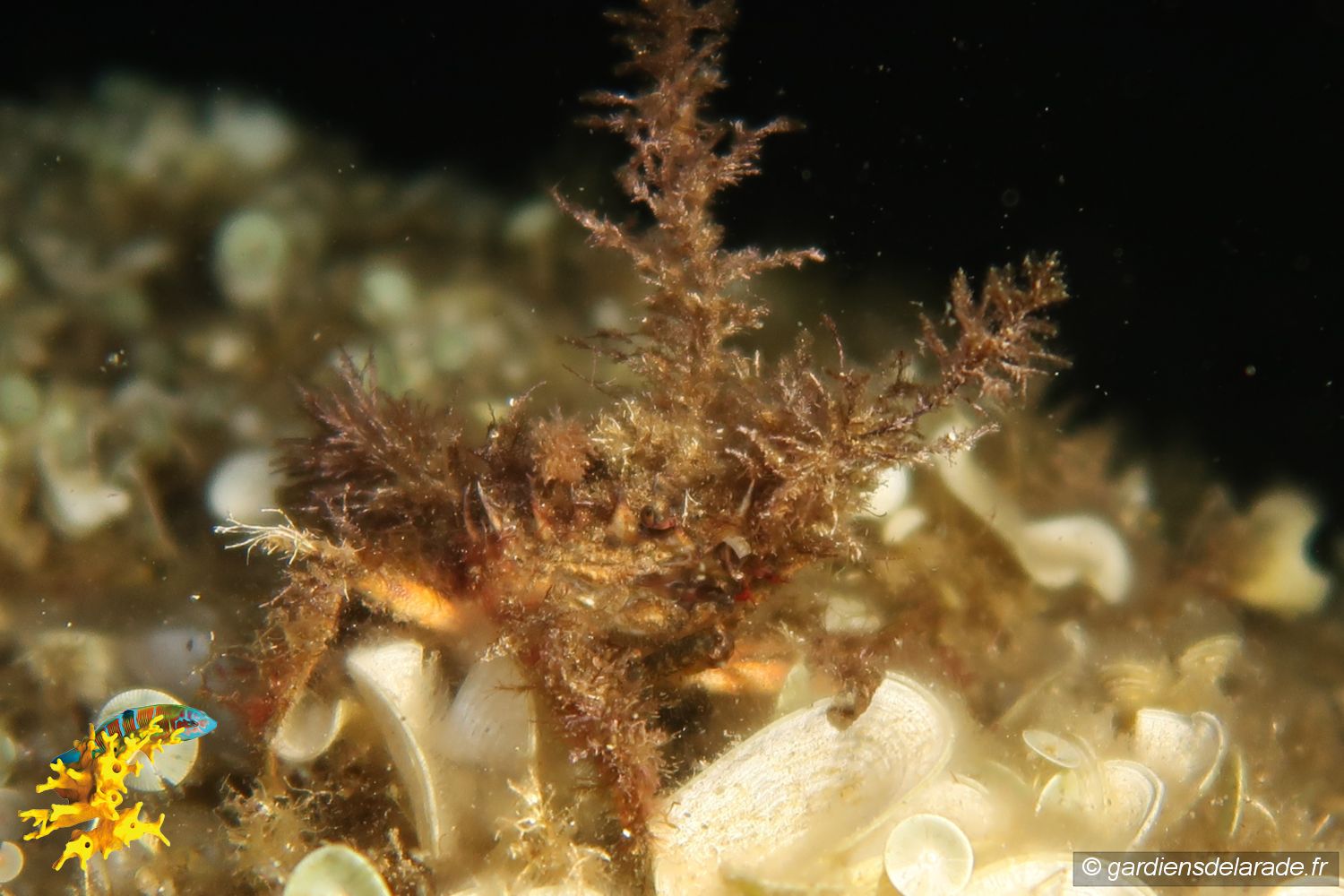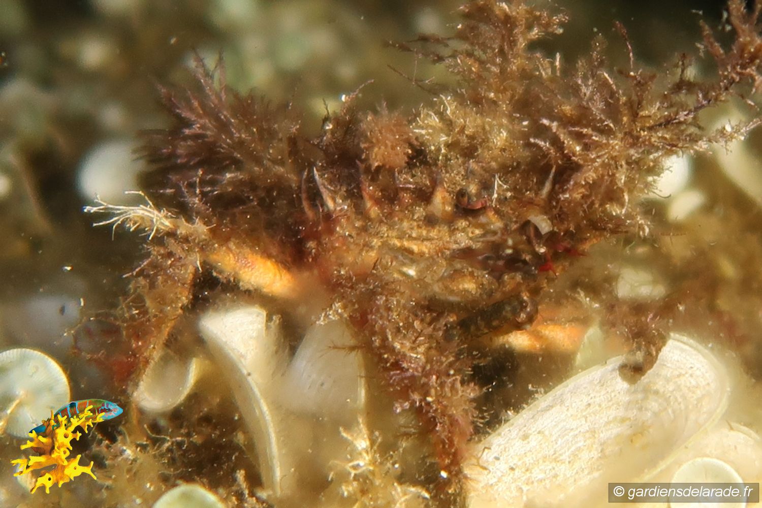 Une petite araignée de mer (surement Maja crispata) dont la carapace de taille maximale de 8 à 9 cm de long est couverte d’algues (épibiontes) coure sur le gazon d’algues d’un rocher. Difficile de distinguer ses formes ni ses pattes mais grâce aux photographies nous vous laissons retrouver ses yeux, ses pinces et ses mandibules ainsi que les épines qui ornent sa carapace.