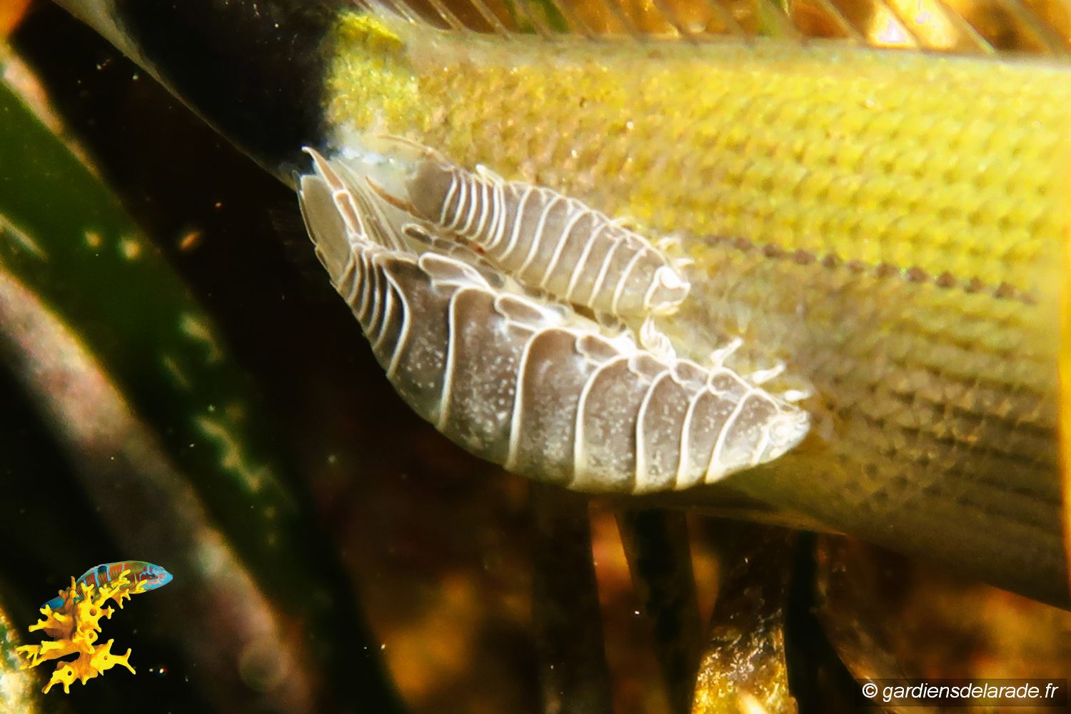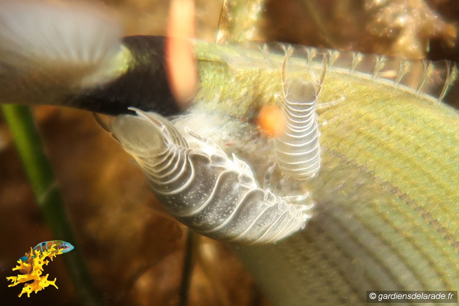 Un couple d’anilocres est fermement accroché sur le corps d’une oblade, l’individu le plus gros est la femelle (ectoparasite). Les anilocres sont d'abord mâles, puis deviennent femelles (protandrie). Leur corps composé de la tête avec des yeux bien visibles, d’un thorax de sept segments et d’un abdomen de six segments pour atteindre une longueur 3 cm. Leurs sept paires de pattes sont équipées de crochets de fixation qui leur permettent de se s’agripper fermement sur les poissons dont elles se nourrissent du sang, mais aussi du mucus et des tissus cutanés.