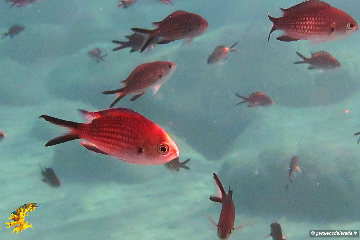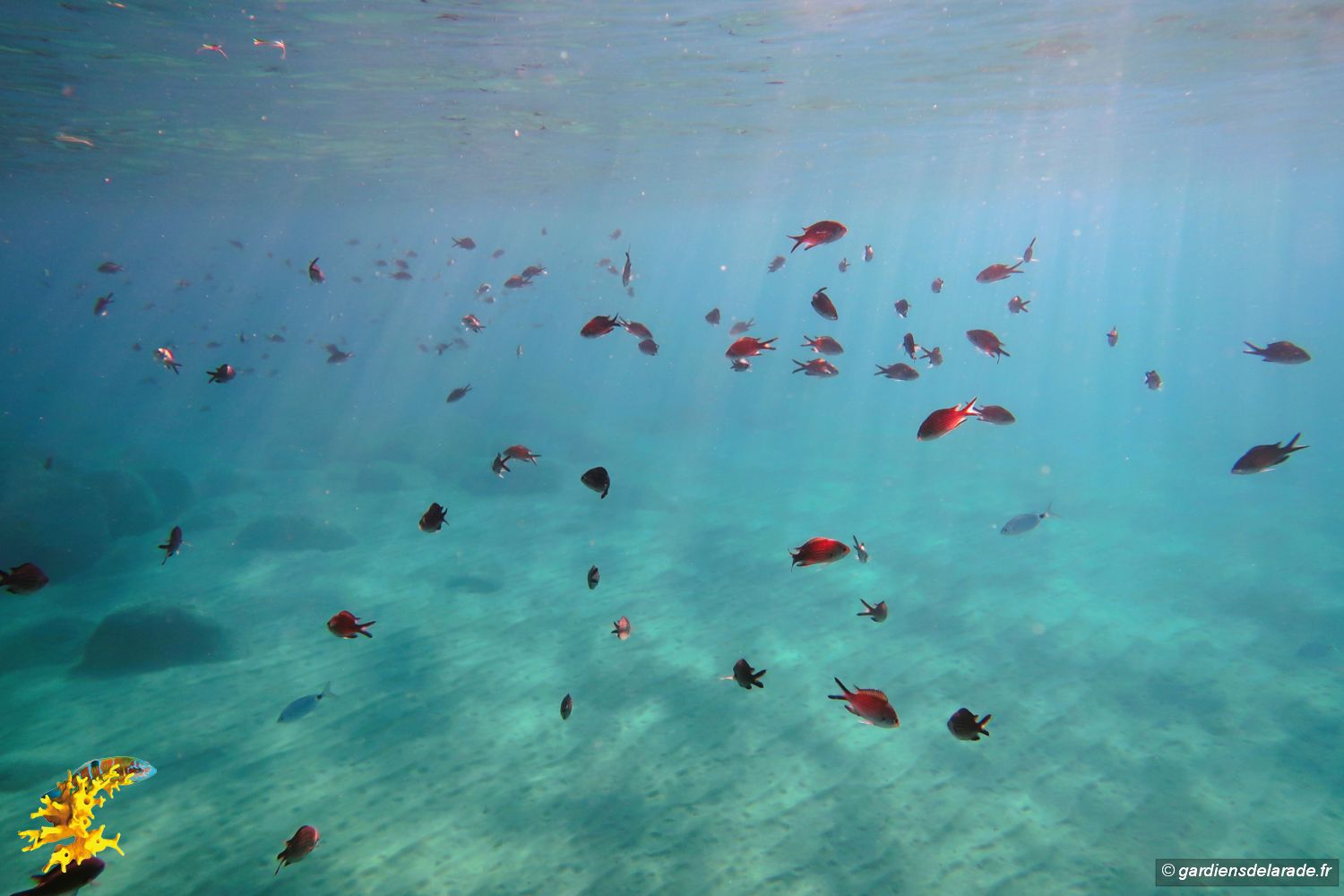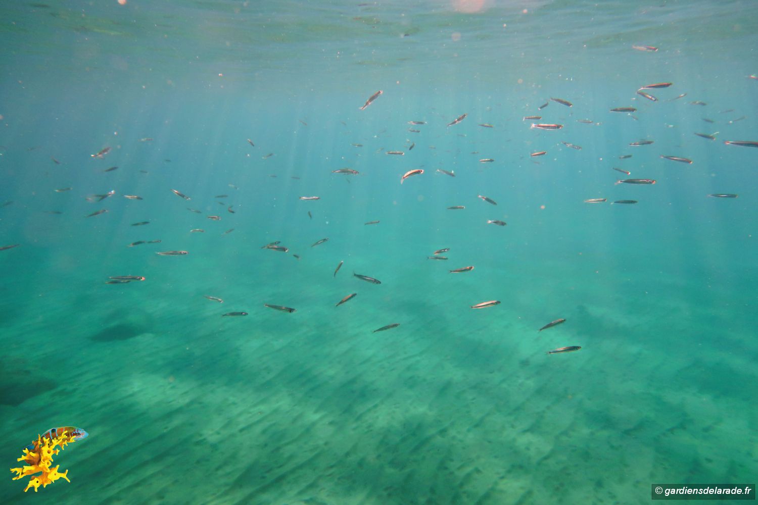 L’occasion de prendre le temps pour une balade matinale, douce, en apnée pour croiser les bancs de Castagnoles (chromis chromis) en train de se nourrir. Leur robe sombre contraste avec les éclats d’argent des bancs d’anchois qui se nourrissent également dans les mêmes eaux.