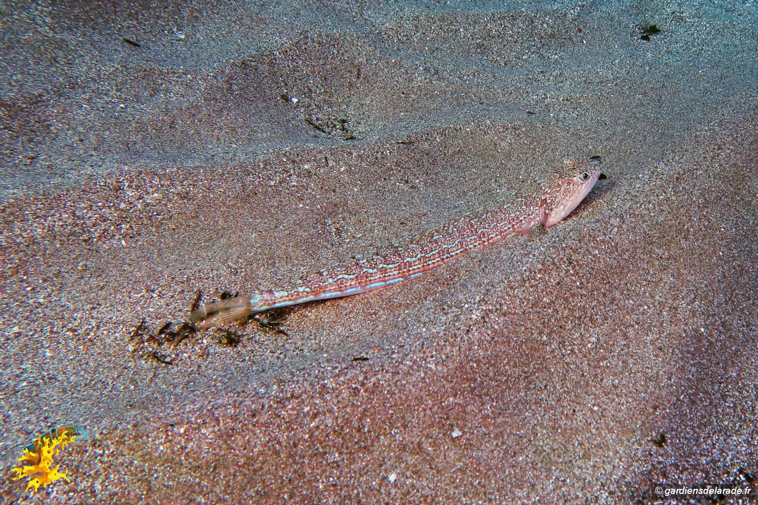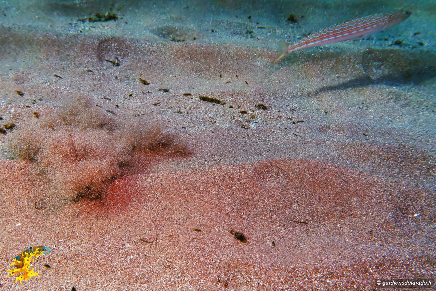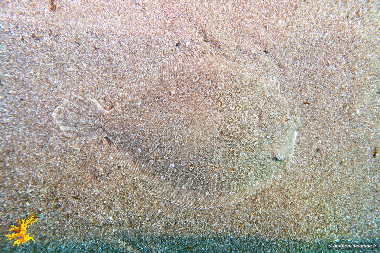 Une vive est en éveil semi enfouie dans le sable, difficile à distinguer grâce à sa robe mimétique, véritable cape d'invisibilité, effrayée par le flash, elle déguerpie en faisant un petit nuage de sable d’un coup de queue pour dérouter l’éventuel prédateur. Pas très loin, posé sur le fond un rombou (Bothus podas) lui aussi à la robe très mimétique, immobile, il espère sans doute échapper à l’œil du promeneur sous-marin.