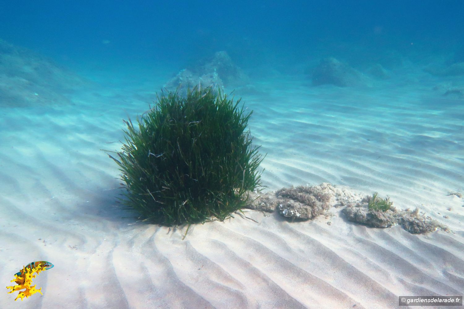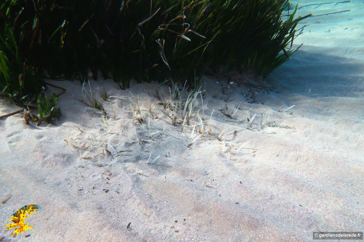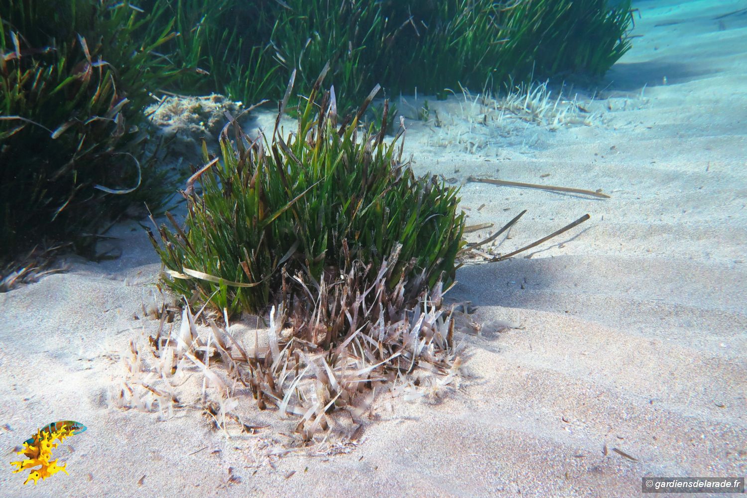 Un ilot de Posidonie se distingue au milieu du sable, tel une palmeraie au milieu du désert. Les rhizomes se sont bien ancrés sur les cailloux affleurant mais l’ensablement limitera leur croissance. D’ailleurs un peu plus loin, les rhizomes de Posidonie en limite de l’herbier sont ensablés et meurent comme le montrent les feuilles rabotées et décolorées.