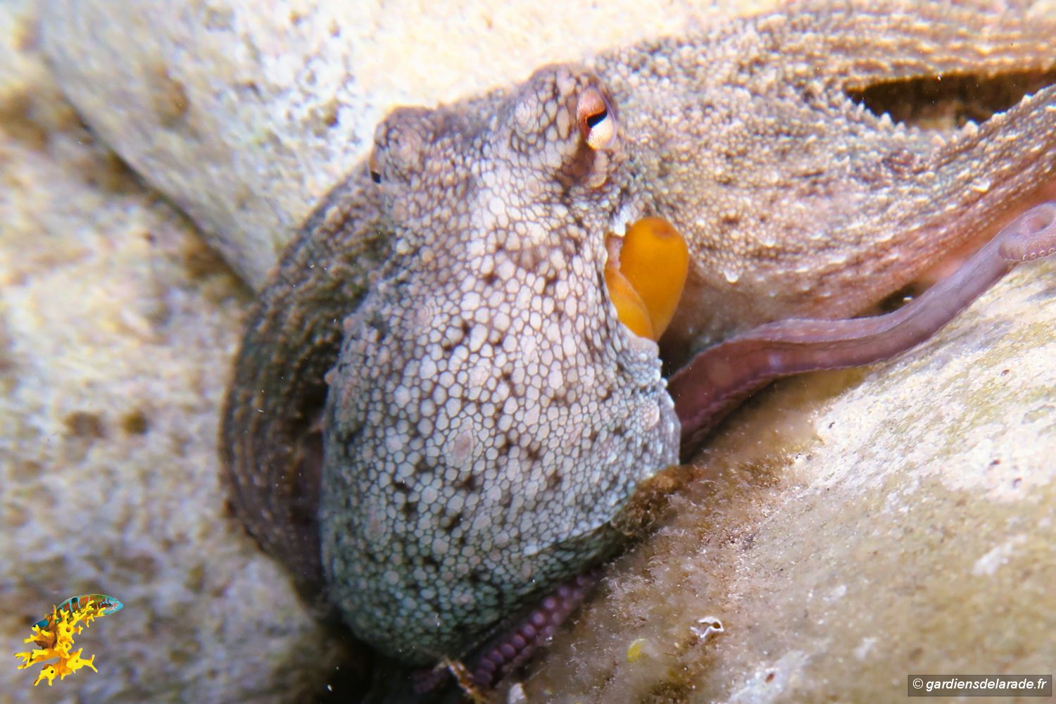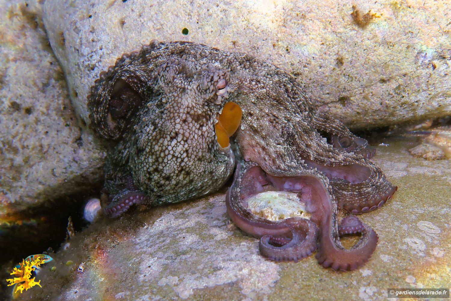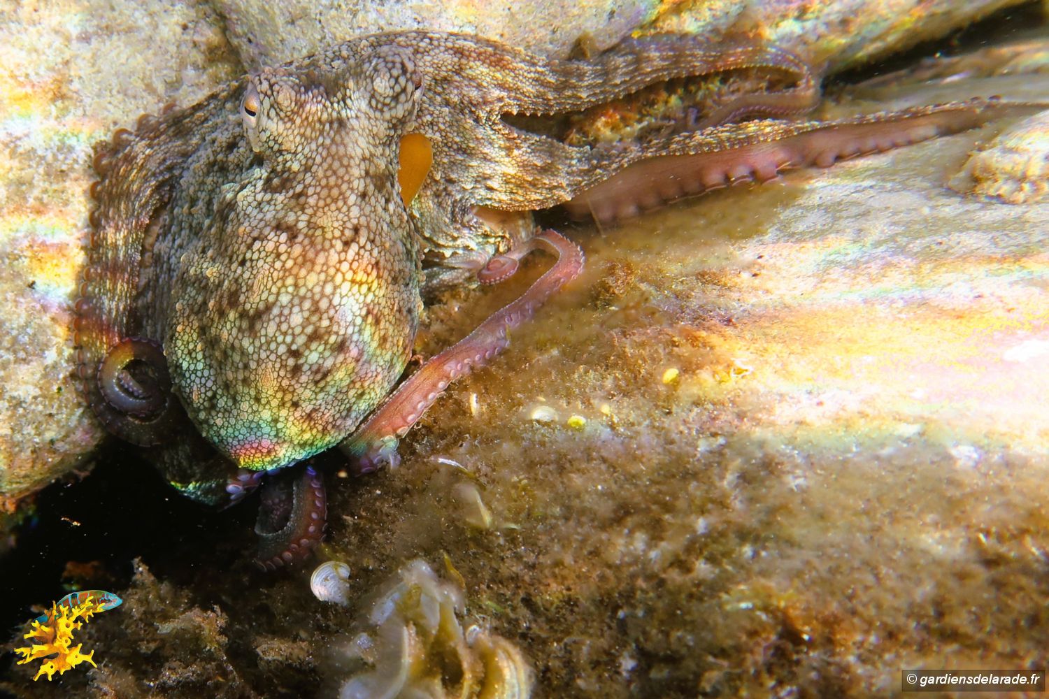 Le poulpe est toujours la créature sous-marine la plus attachante, dans moins de 50 cm d’eau, un très jeune poulpe observe les entrées-sorties des humains de son univers marin…