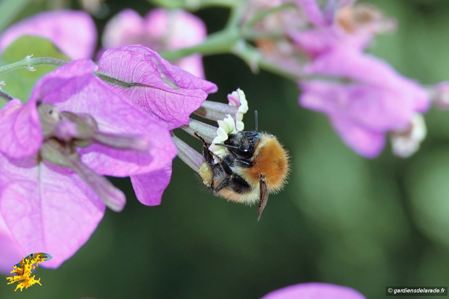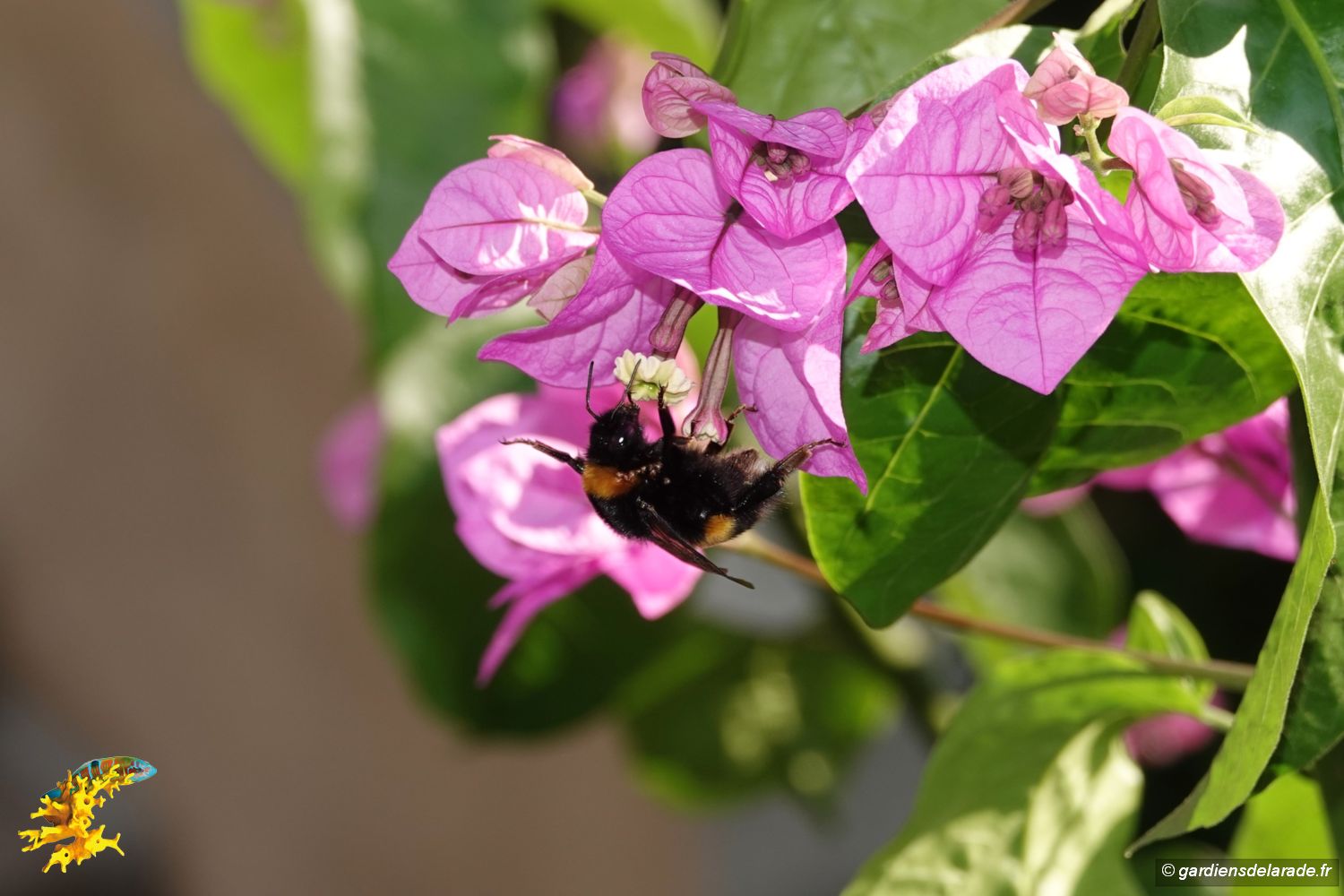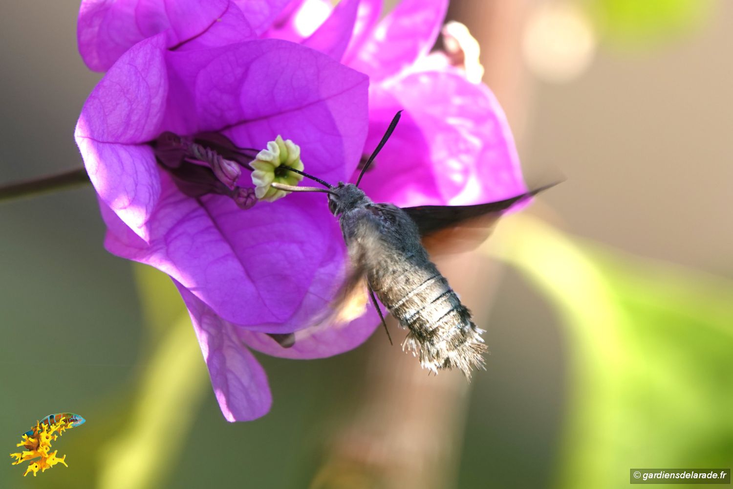 Les fleurs de Bougainvillier attirent les papillons comme le macahon (Papilio machaon) aussi appelé grand porte-queue car il peut mesurer, ailes déployées, presque 10 centimètres d’envergure. Un autre papillon encore visible en ce mois d’octobre, le moro-sphinx (Macroglossum stellatarum) dont le vol rappelle celui du colibri. Des bourdons viennent aussi butiner ses fleurs.