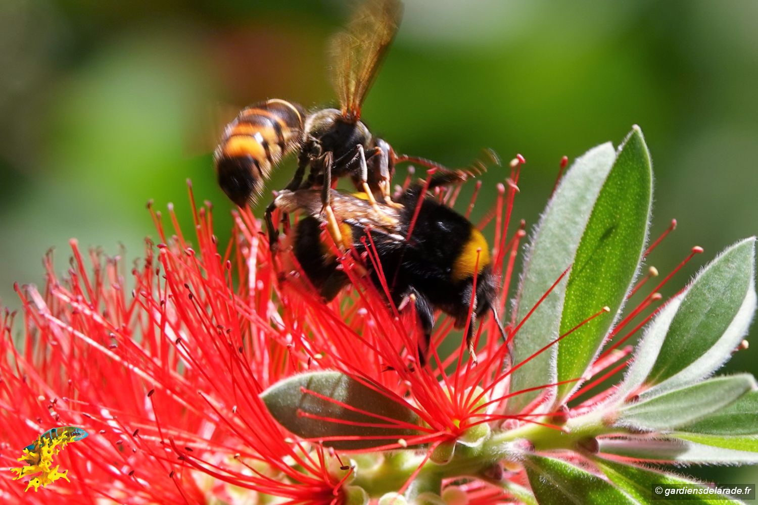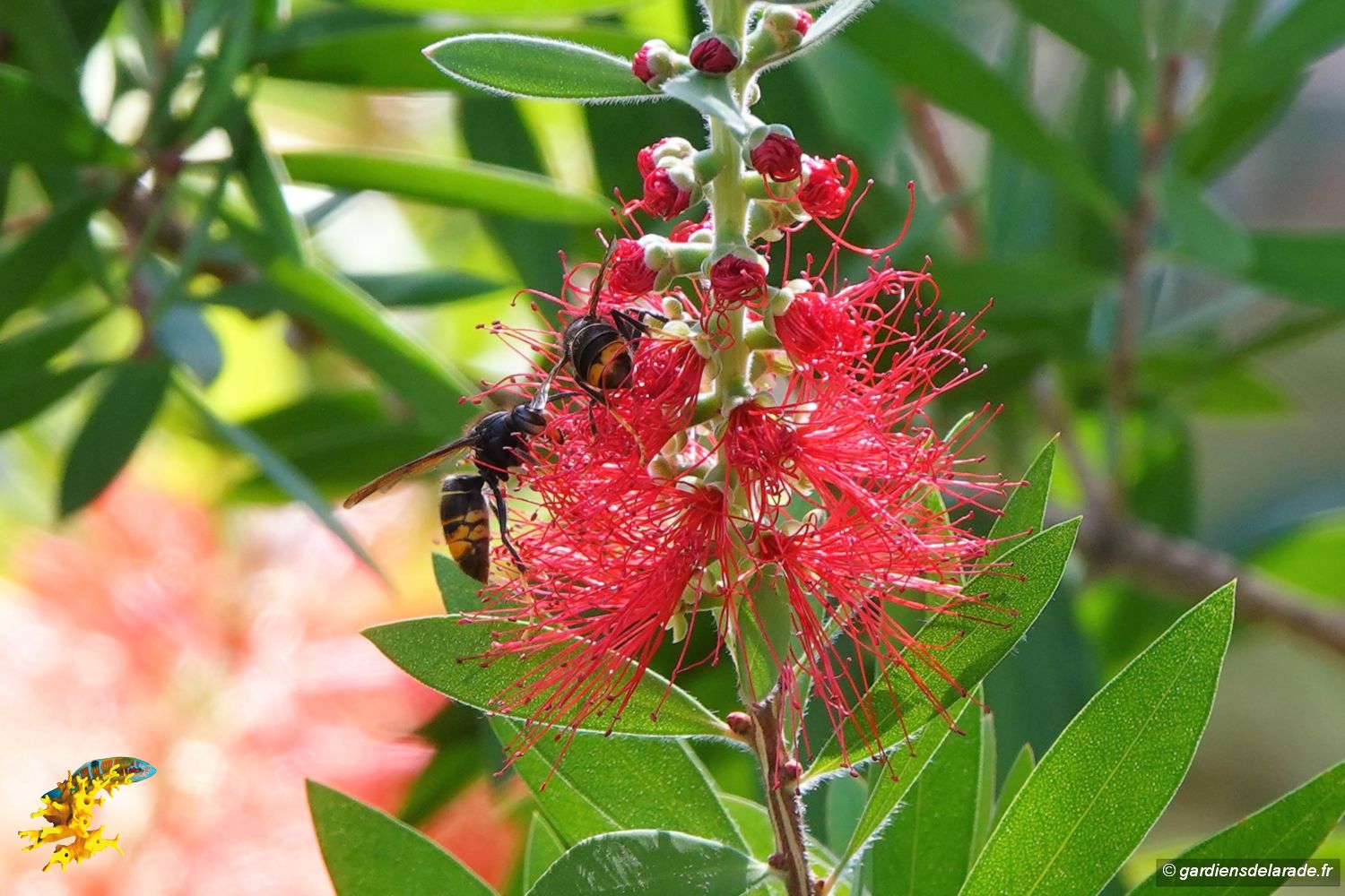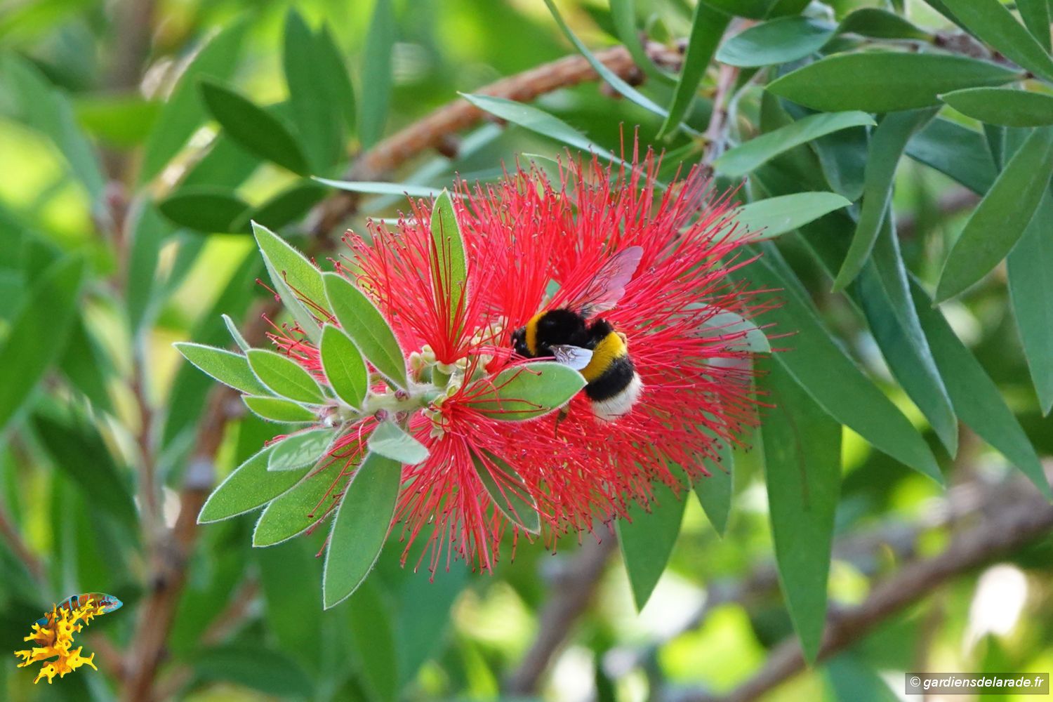 D’origine australienne, le rince-bouteille (Callistemon citrinus) est appelé ainsi à cause de ses fleurs d'un rouge cramoisi en épis de 5 à 15cm de long, en forme d'écouvillon. Les fleurs mellifères et nectarifères attirent de nombreux insectes durant la floraison qui va du printemps à l'été. Ainsi, les frelons asiatiques et les bourdons les butinent encore de nos jours. Les frelons asiatiques n’hésitent pas d’ailleurs à chasser les bourdons.