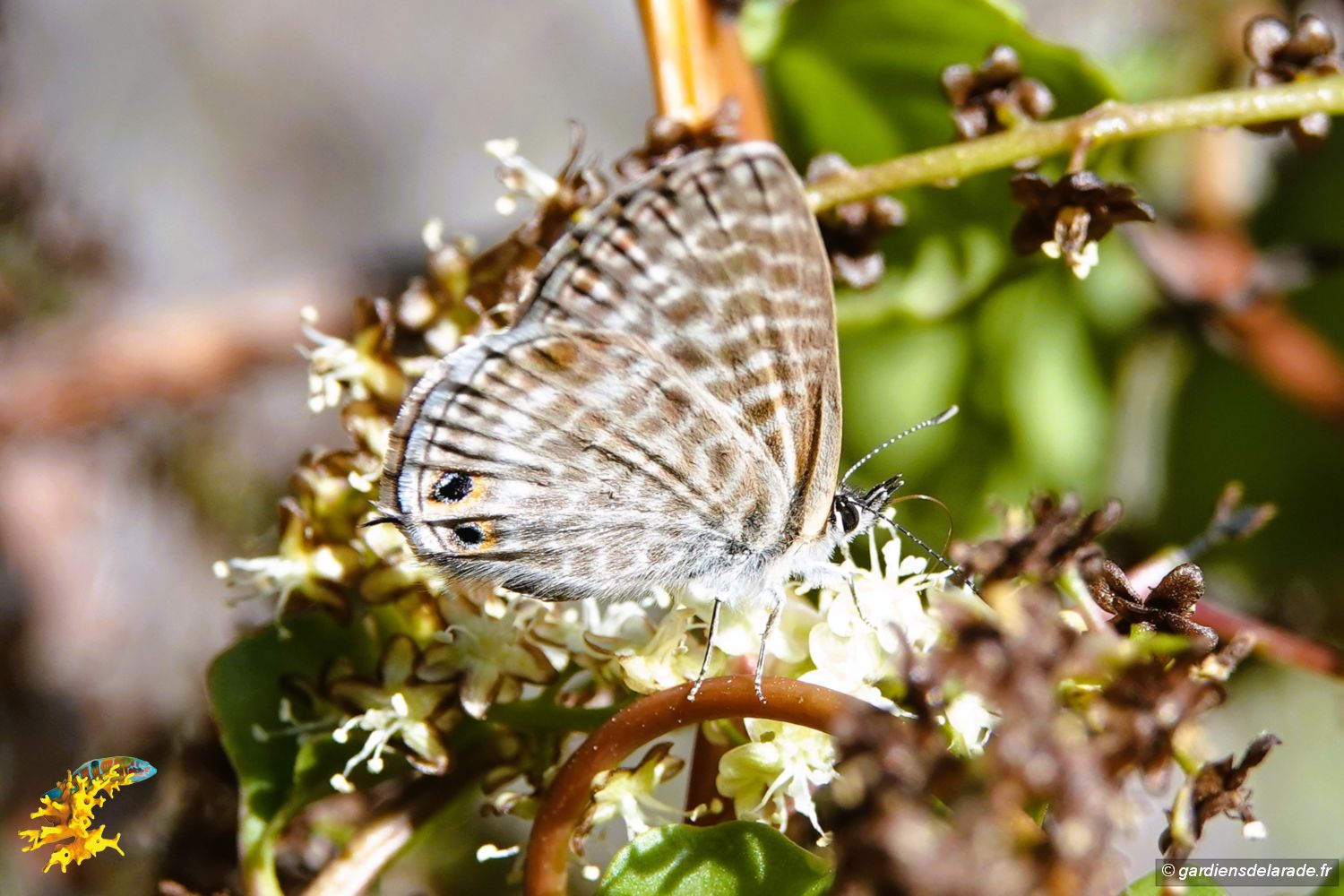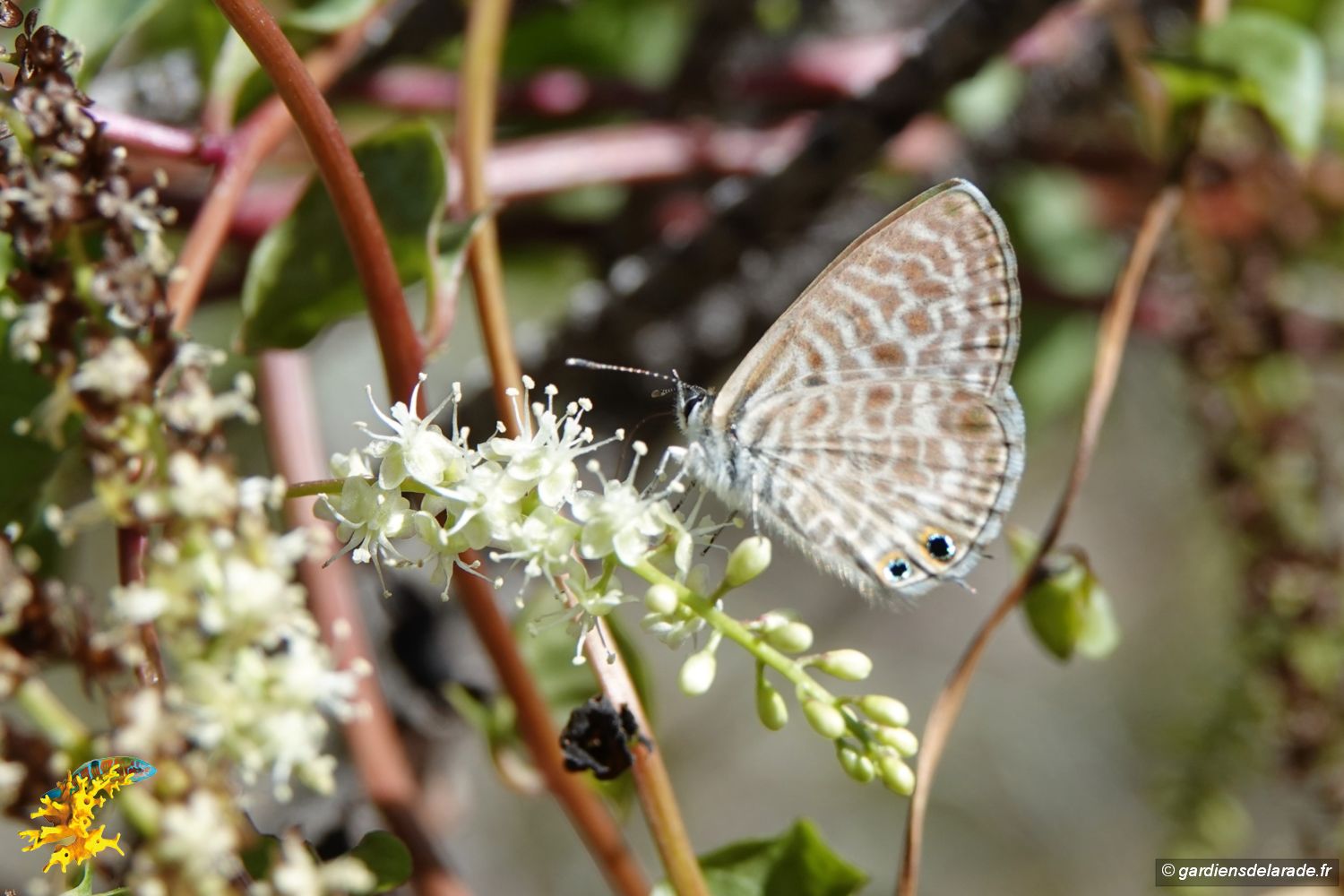 La Liane de Madère (Anredera cordifolia ) est une grimpante volubile luxuriante à croissance rapide, originaire d'Amérique du Sud (du sud du Brésil au nord de l'Argentine. En automne, des grappes de 30 cm de long, composées de minuscules fleurs blanches, au parfum d'amande, se développent à la base des jeunes pousses. Elles attirent en grand nombre l'azuré de Lang (Leptotes pirithous), appelé aussi L’azuré de la luzerne, petit papillon migrateur de couleur violine tirant sur le bleu ardoisé chez le mâle et sur le marron chez la femelle. Le revers des ailes est beige foncé zébré de lignes blanches et orné à l'aile postérieure de deux tâches marginales de couleur orange centrées de noir à l'angle anal, lequel se termine par une petite queue fine. Il est présent en France sur le pourtour méditerranéen.