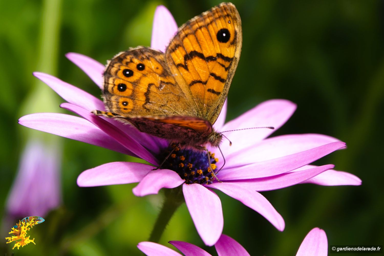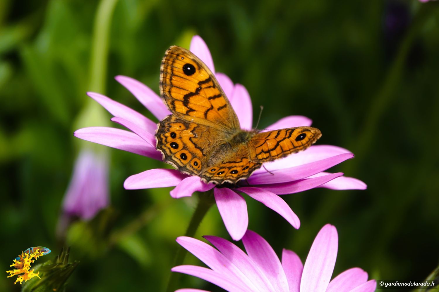 Un papillon est visible en ce moment se réchauffant au soleil posé les ailes bien ouvertes sur le sol des sentiers. Il est facilement identifiable par la couleur jaune orangé de ses ailes marquées de 3 traits bruns. C’est la Mégère encore appelé Satyre, joli papillon classé par les scientifiques comme Lasiommata megera.