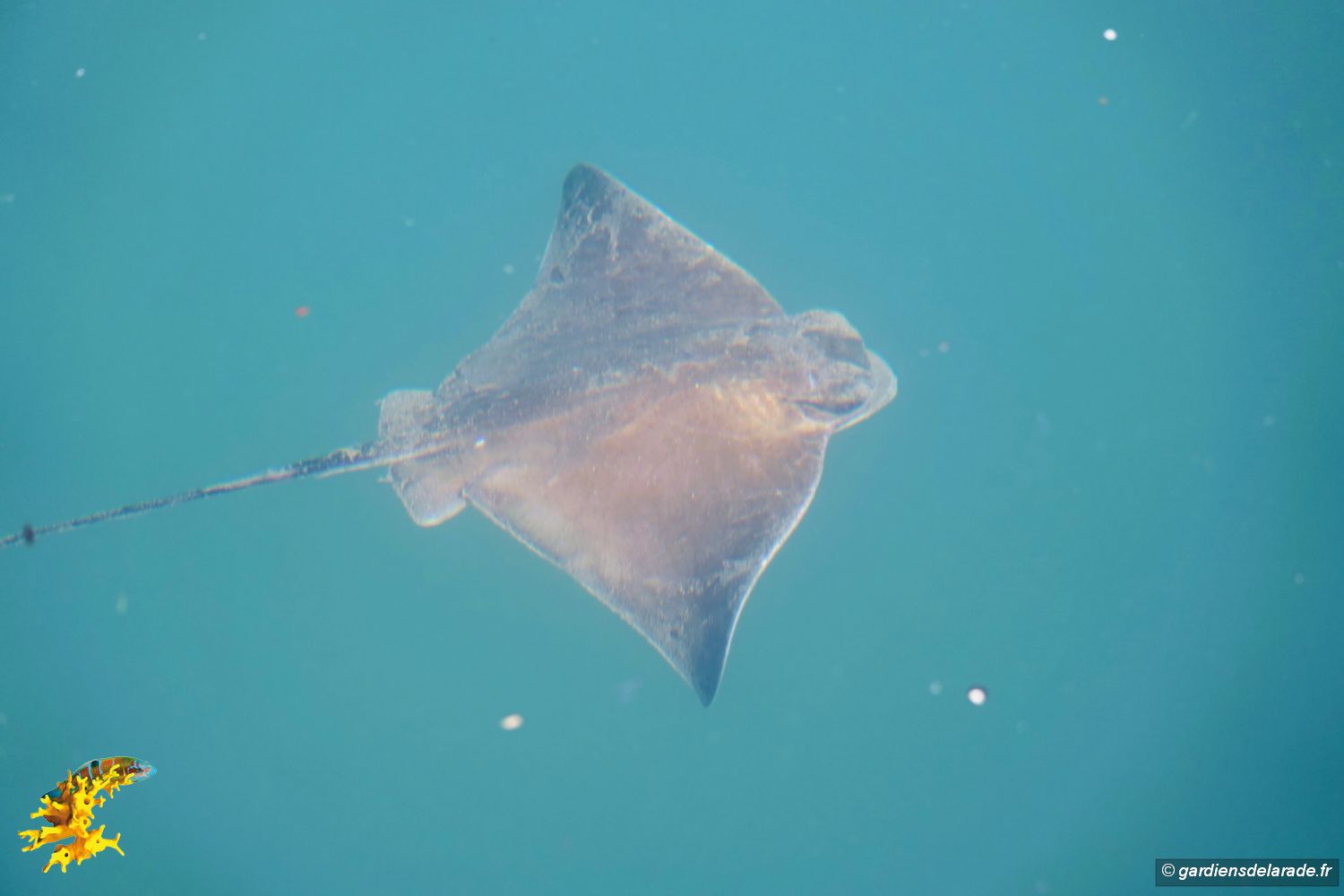 Un petit individu appartenant à l’espèce de raie Aigle, appelé Myliobatis aquila par les scientifiques, nageait ce matin vers 10h00 au milieu des débris de plastique à la surface des eaux du port, certainement à la recherche de la sortie.