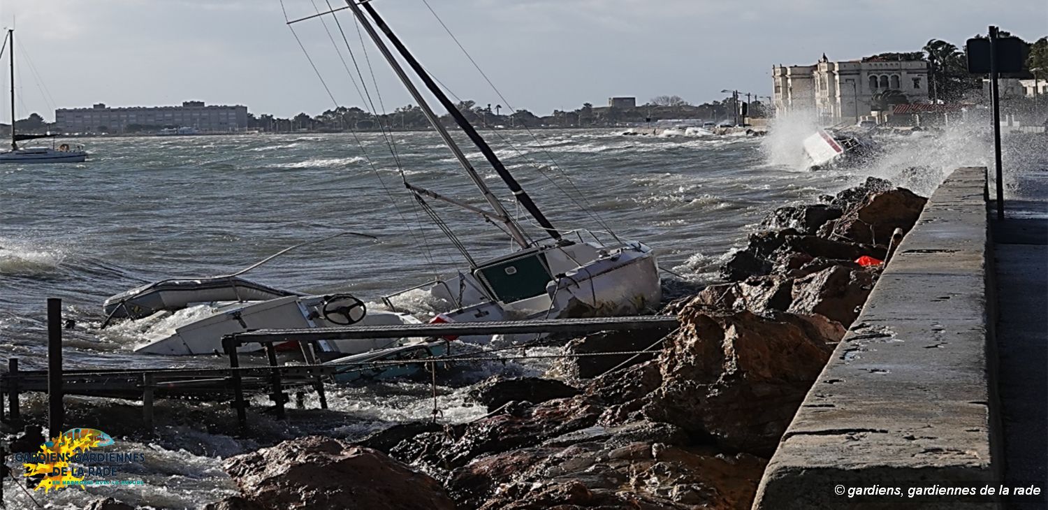 Les coups de vent d’est provoquent des échouages de bateaux le long du littoral de la partie sud de la petite rade de Toulon, la plus exposée au vent d’est. Les épaves rejoignent celles déjà échouées et immergées dans ce secteur qui n’ont pas été enlevées. Un premier inventaire des épaves de ces bateaux de plaisance (voiliers et canots à moteur) échoués au niveau du littoral de Saint-Mandrier-sur-Mer et de la Seyne-sur-Mer a été réalisé le 20 février 2023. Une première version révisée a été publiée le 1er mars 2023.